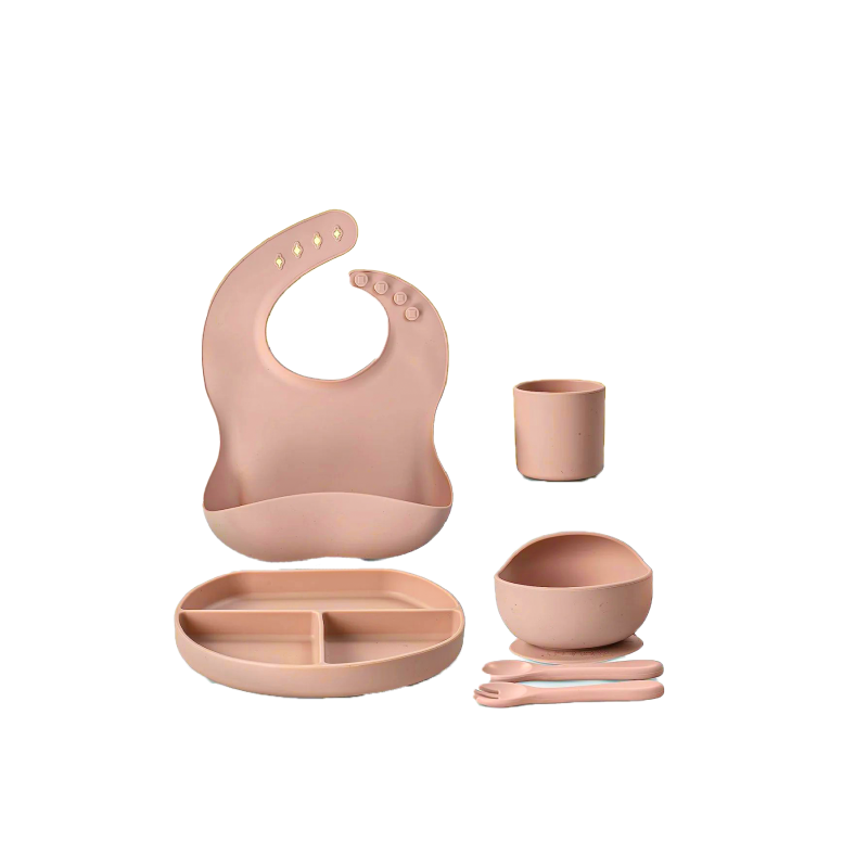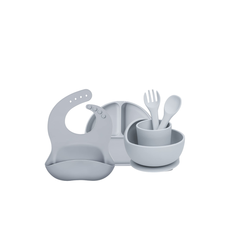 Silicone baby meal time set made from food-grade, BPA-free silicone. Designed to support safe and independent eating for your little one. Includes easy-to-hold, toddler-friendly pieces that are soft, lightweight, and durable. The fun and practical design makes mealtime easier and more enjoyable.